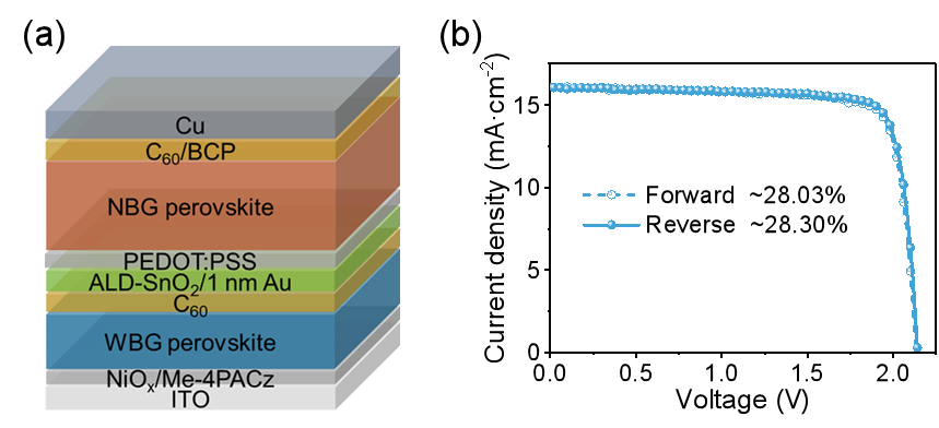 图2 (a)全钙钛矿叠层电池的结构示意图和(b)J-V曲线