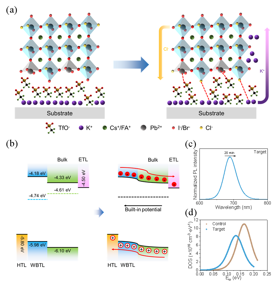 图1(a)TfOK作用机制示意图,(b)形成梯度异质结示意图,(c)宽带隙钙钛矿相偏析情况分析和(d)缺陷分布分析