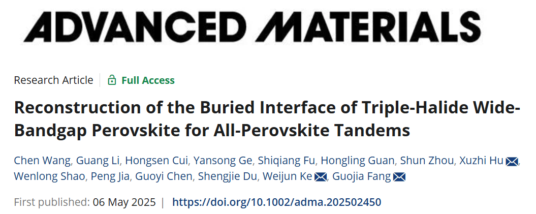近日,我校WilliamHill中文先进能源与未来显示技术团队在《Advanced Materials》上发表题为“Reconstruction of the buried interface of triple-halide wide-bandgap perovskite for all-perovskite tandems”的论文(论文链接: https://advanced.onlinelibrary.wiley.com/doi/full/10.1002/adma.202502450)。williamhill中国为第一单位,武汉大学为合作单位,王晨博士为论文的第一作者,方国家教授、柯维俊教授和胡绪志博士为论文的共同通讯作者。