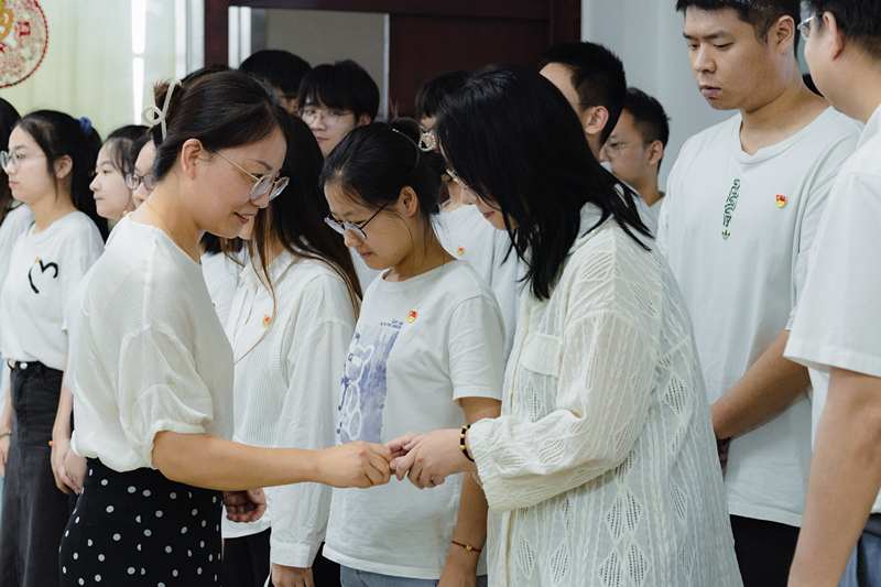 接着,各党支部书记为新发展学生党员佩戴党员党徽,鼓励大家亮明党员身份,维护党员形象,彰显党员担当。