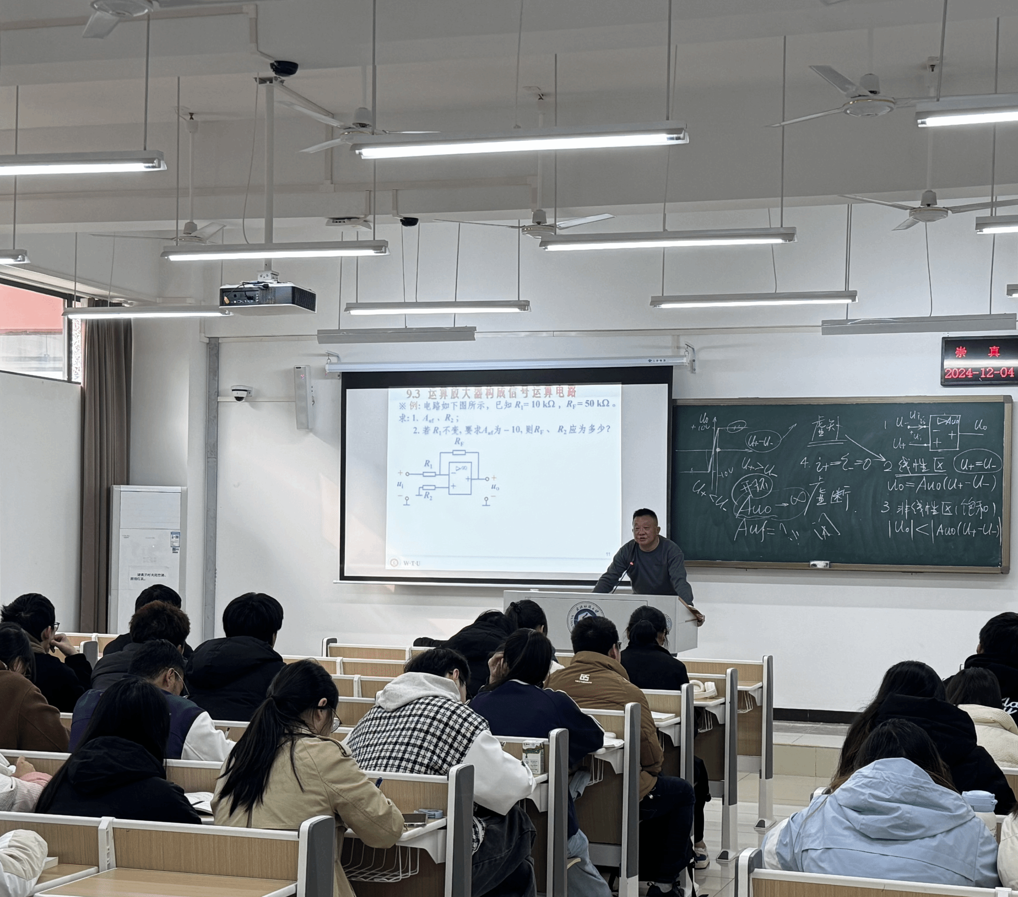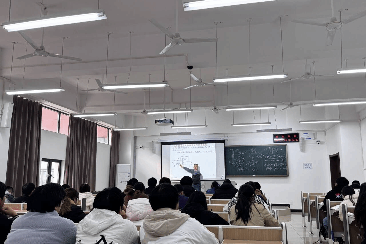课堂上,王水兵用他那洪亮且充满激情的声音,将知识如涓涓细流般传递给学生。每一个理论的讲解,都像是在诉说着他多年教学沉淀的智慧结晶。在介绍运算放大器时,他从公式推导开始,一步步深入,那些看似枯燥的符号和数字在他的讲述下,仿佛有了生命。他所列举的每一个典型实例,都是他多年教学经验的积累,每一个实例都像一个生动的故事,牢牢吸引着学生的注意力,激发着他们对知识的强烈渴望。他就像一位知识的引路人,带领学生在电工电子学的海洋中畅游。他那和蔼可亲的面容,不断鼓励着学生积极参与讨论;他与学生互动时的笑容,如同冬日里的暖阳,温暖着整个教室。
