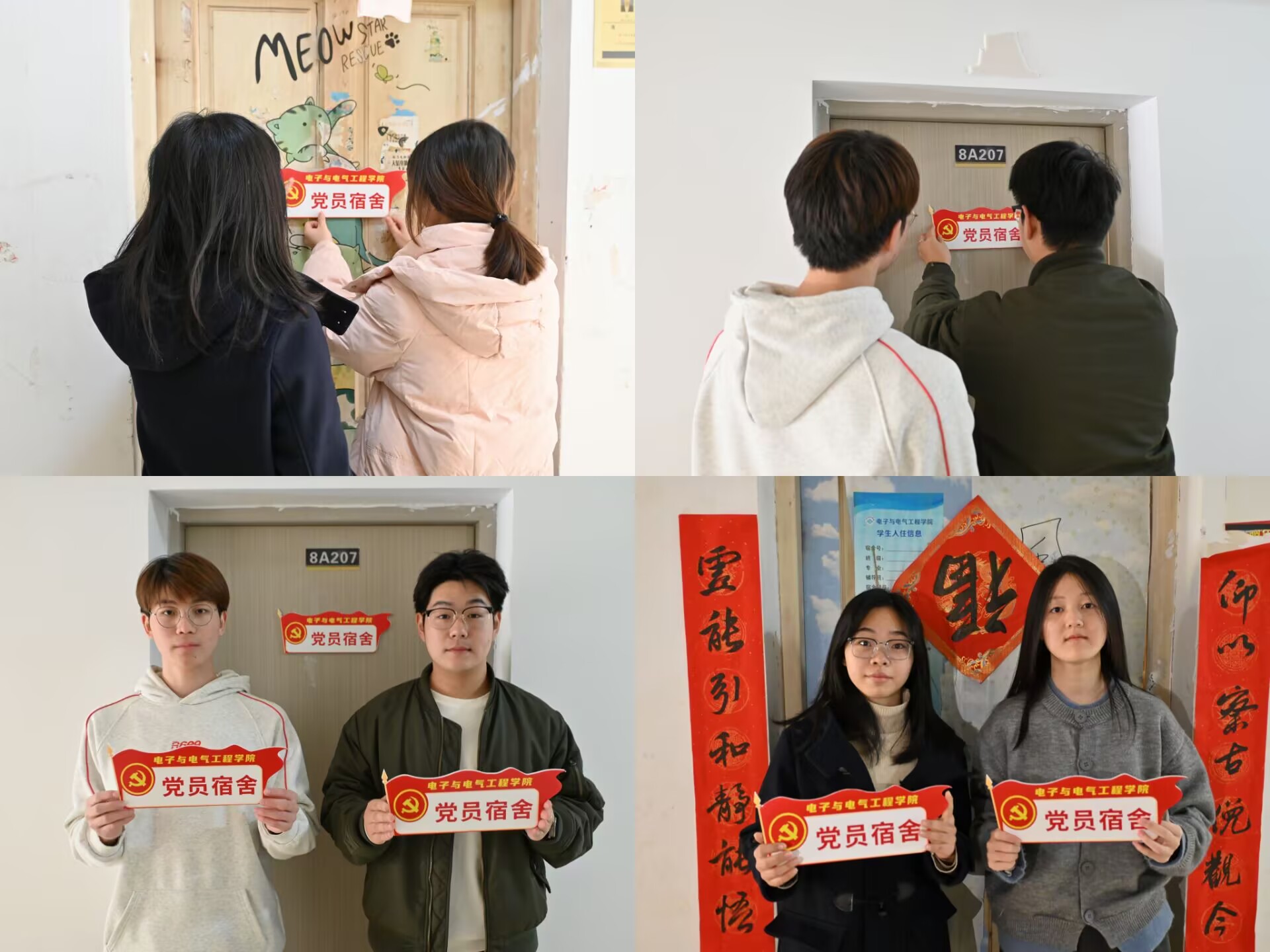 学生宿舍是同学们生活、学习、交流的重要场所,也是观察学生党员思想动态与先锋作用的“窗口”。“党员宿舍”挂牌不仅是学生党员身份的直观体现,更是一份责任的昭示。活动现场,学院师生党员一同张贴“党员宿舍”标识牌,红色的“党员宿舍”标牌在宿舍门上格外醒目,既让党员们时刻牢记身份与使命,也为其他同学树立了可感可学的身边榜样,推动形成“比学赶超”的良好氛围。