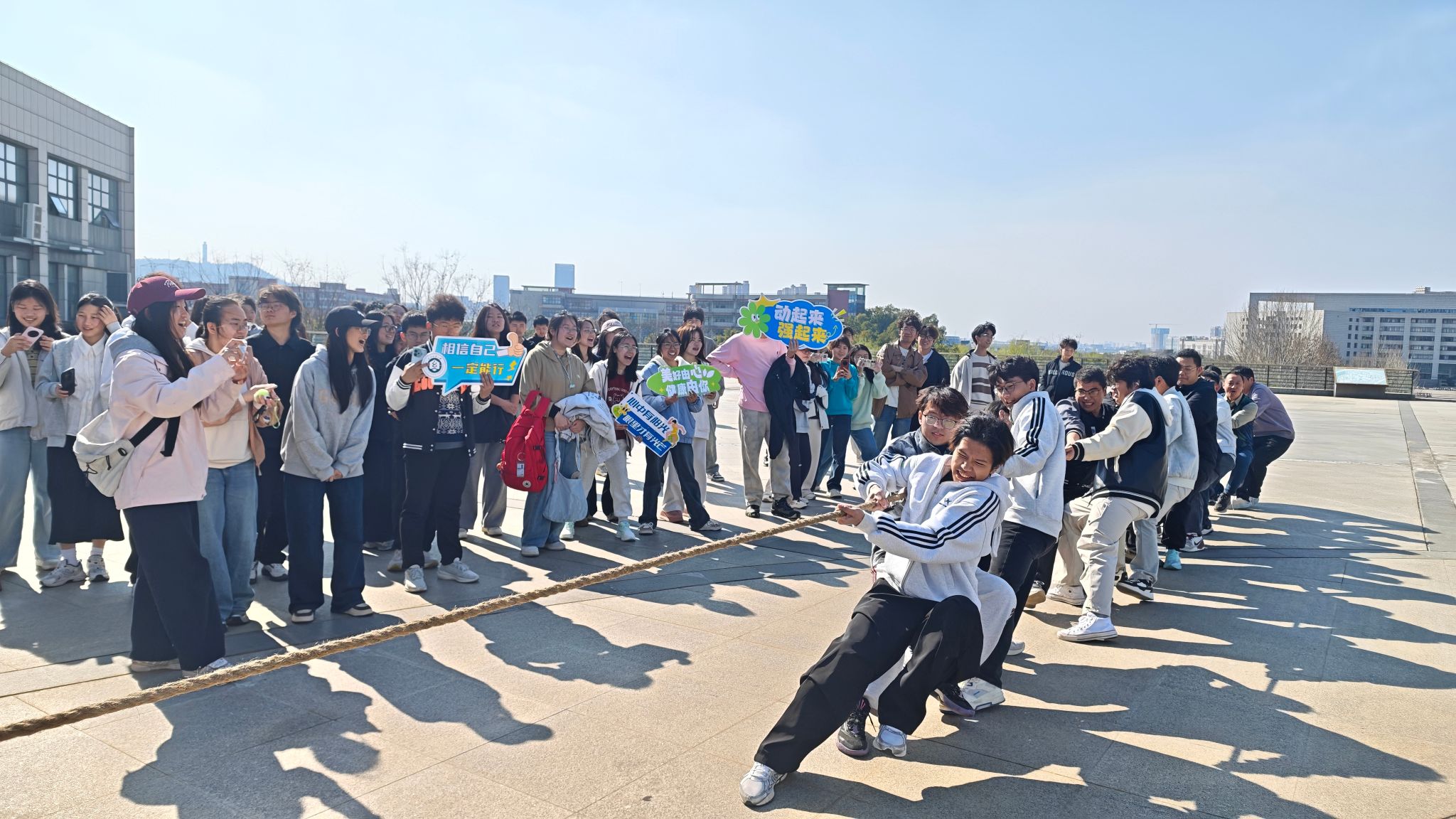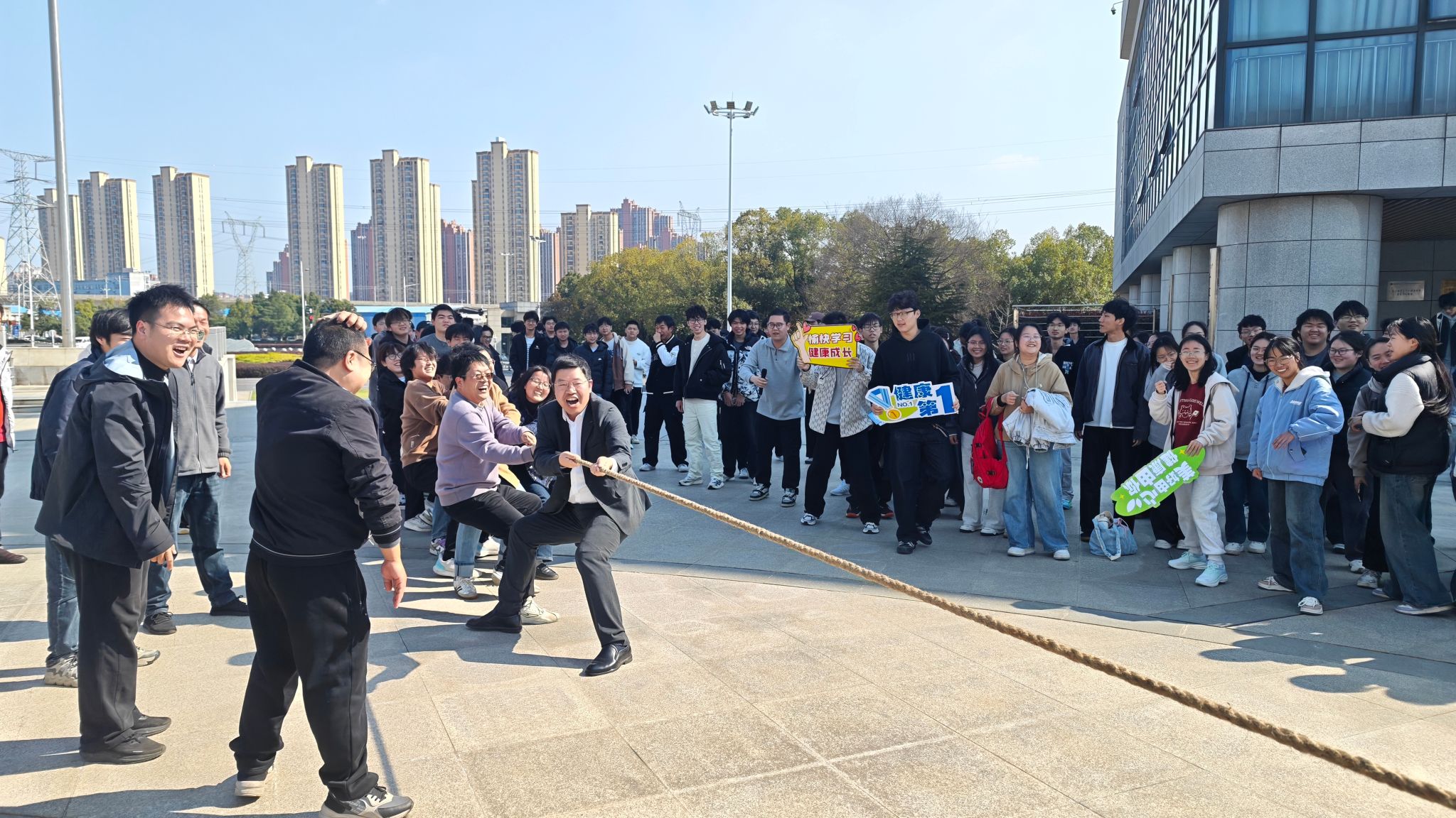 本次健康文化节的首个比赛项目为拔河,吸引了来自各科研团队、各专业的四百余名师生参加。每支参赛队伍由5名教师、12名学生组成。参赛师生齐心协力,在运动中增进交流,收获合作的喜悦。未参赛的师生在场边加油助威,现场欢笑声、加油声此起彼伏,不少学生举着“五育并举 全面发展”“美好由心 健康由你”等手举牌合影留念。