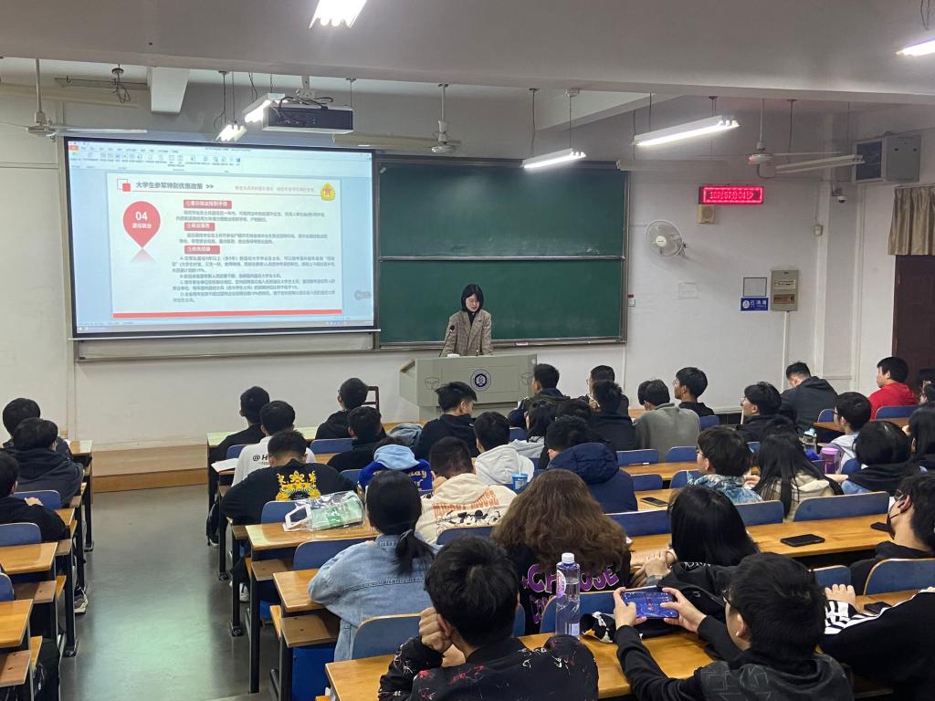 2021级石亚楠老师着重介绍了征兵优待政策和个人入伍发展等方面问题,介绍了参军入伍大学生的相关政策以及参军对学生本人的影响,让退伍学生以自己亲身经历介绍军营生活,鼓励同学们参军入伍,实现人生价值。