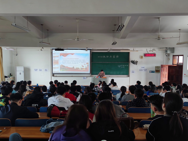 2018级辅导员夏奎老师组织毕业班学生集中宣讲征兵的意义及相关优惠政策,对征兵入伍条件,退役复学后考研、经济补助等方面政策进行了详细的解释说明,接着介绍了征兵工作的预征对象、身体条件等情况,回答了同学们提出的有关学费问题、毕业走兵政策等相关问题。