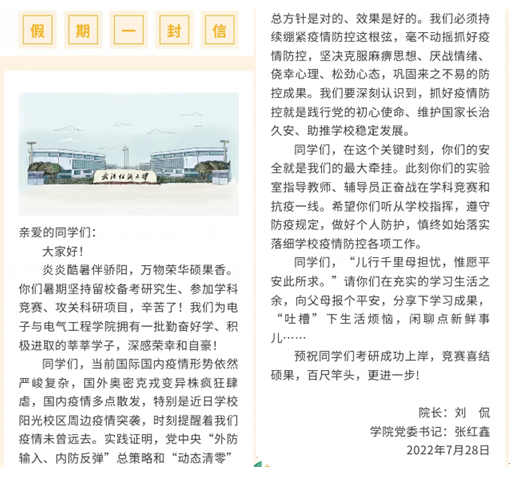 为做好疫情防控及暑期留校学生的日常管理工作,学院持续开展“一下三民”活动,进一步落实落细学校防疫规定,保障暑期留校学生安心安全地学习生活。暑假期间,特别是7月27日江夏区突发疫情时,学院仍有210多名本科生、60余名研究生留在阳光校区备考研究生、参加学科竞赛和攻关科研任务。学院领导班子、专业教师及学工队伍多方协同开展留校学生安全教育。