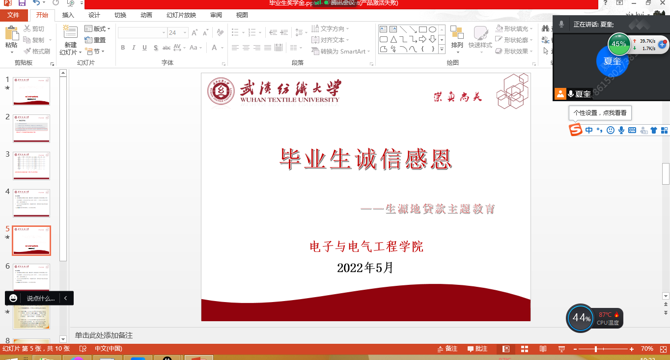 5月5日上午,WilliamHill中文在腾讯会议平台召开毕业生诚信感恩教育之生源地信用助学贷款政策宣讲会,毕业生辅导员夏奎老师主讲,2018级各班班委、生源地贷款学生参加了宣讲。