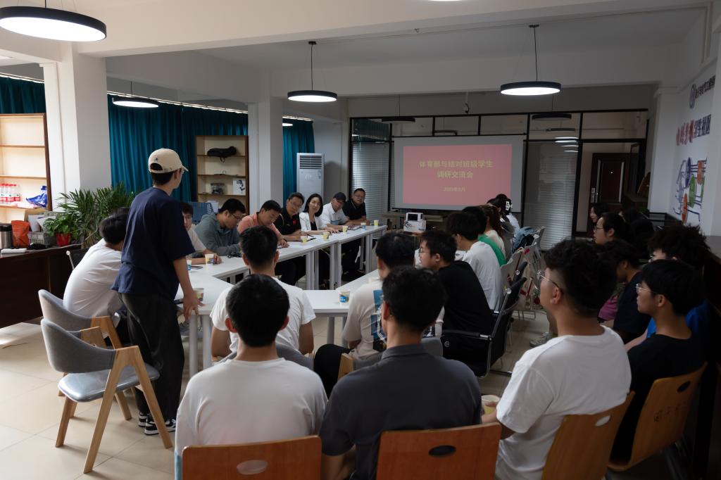 随后,体育部在“电燃梦想”学生驿站与电信12201班学生开展座谈交流,同学们结合个人实际情况,从体育课程的满意度、体育教学中加大身体素质训练的比重及考核、如何促进学生参与课外群体竞赛活动、部分场馆智能化管理及有偿开放标准等方面提出了建议和意见,为我校体育的发展建言献策。体育部副主任姜铁汉和陈宁对同学们所提的一些困惑进行了解答。杨志强表示体育部会充分研究和讨论大家所提的意见和建议,努力为同学们营造良好的锻炼环境,建立科学、便利的体育评价体系,提升同学们的身体素质。