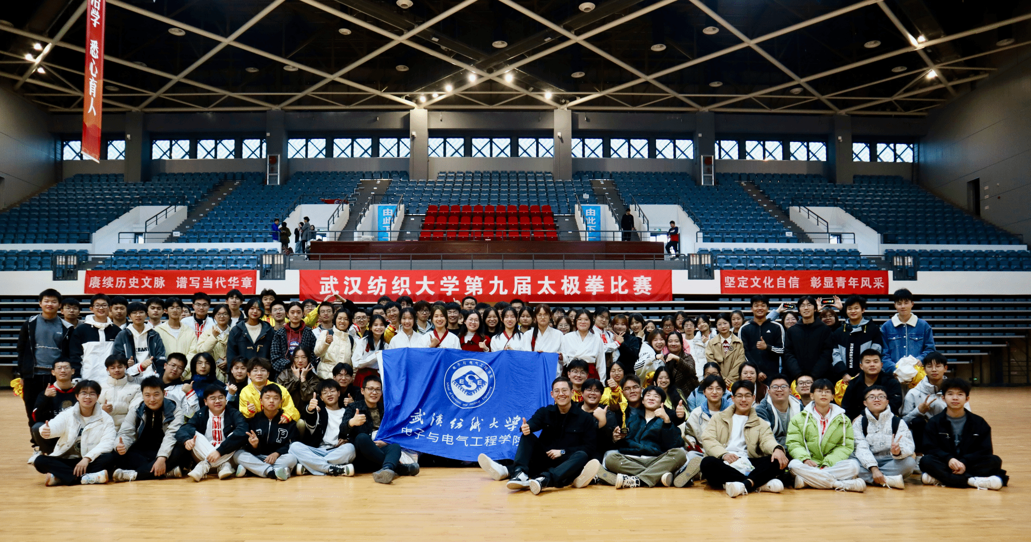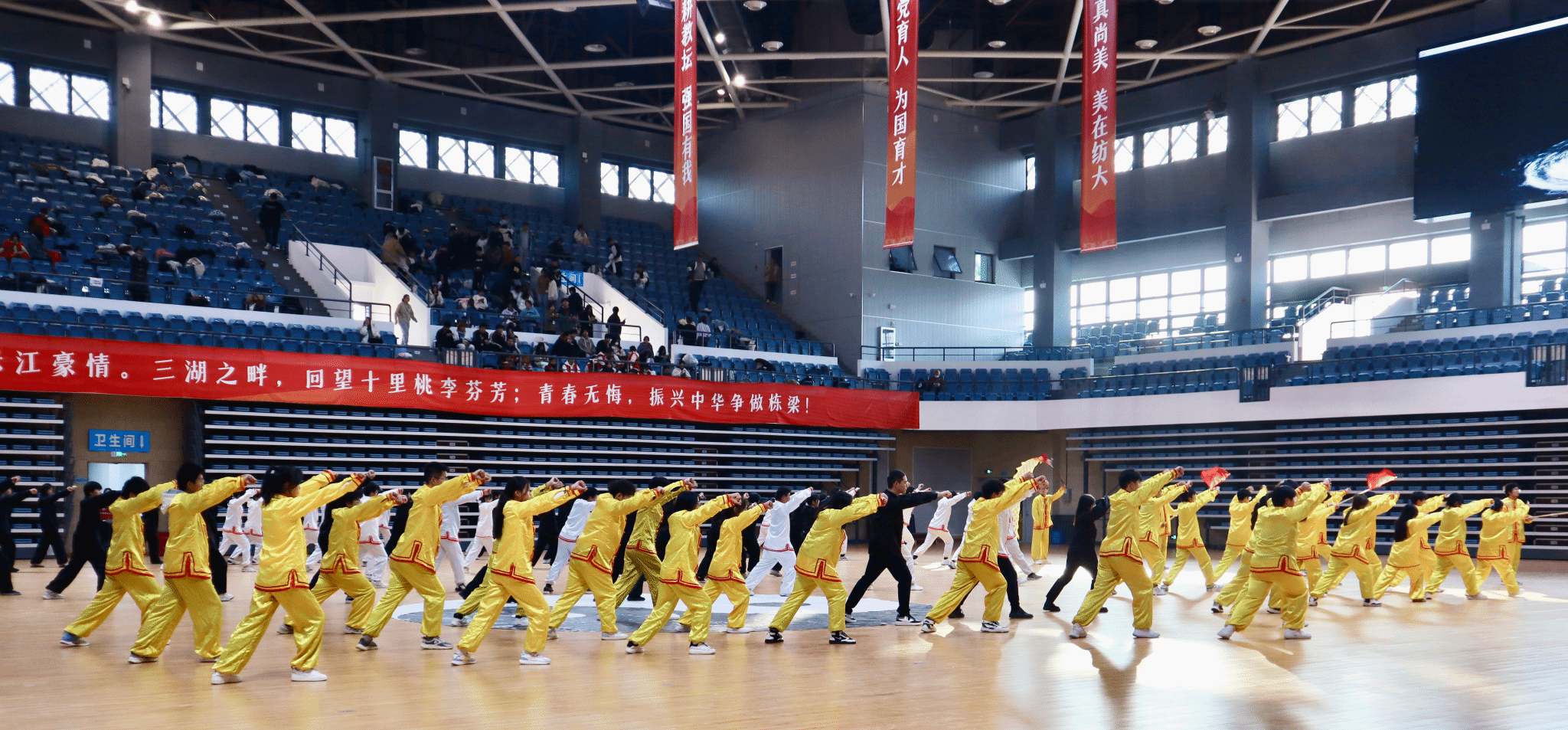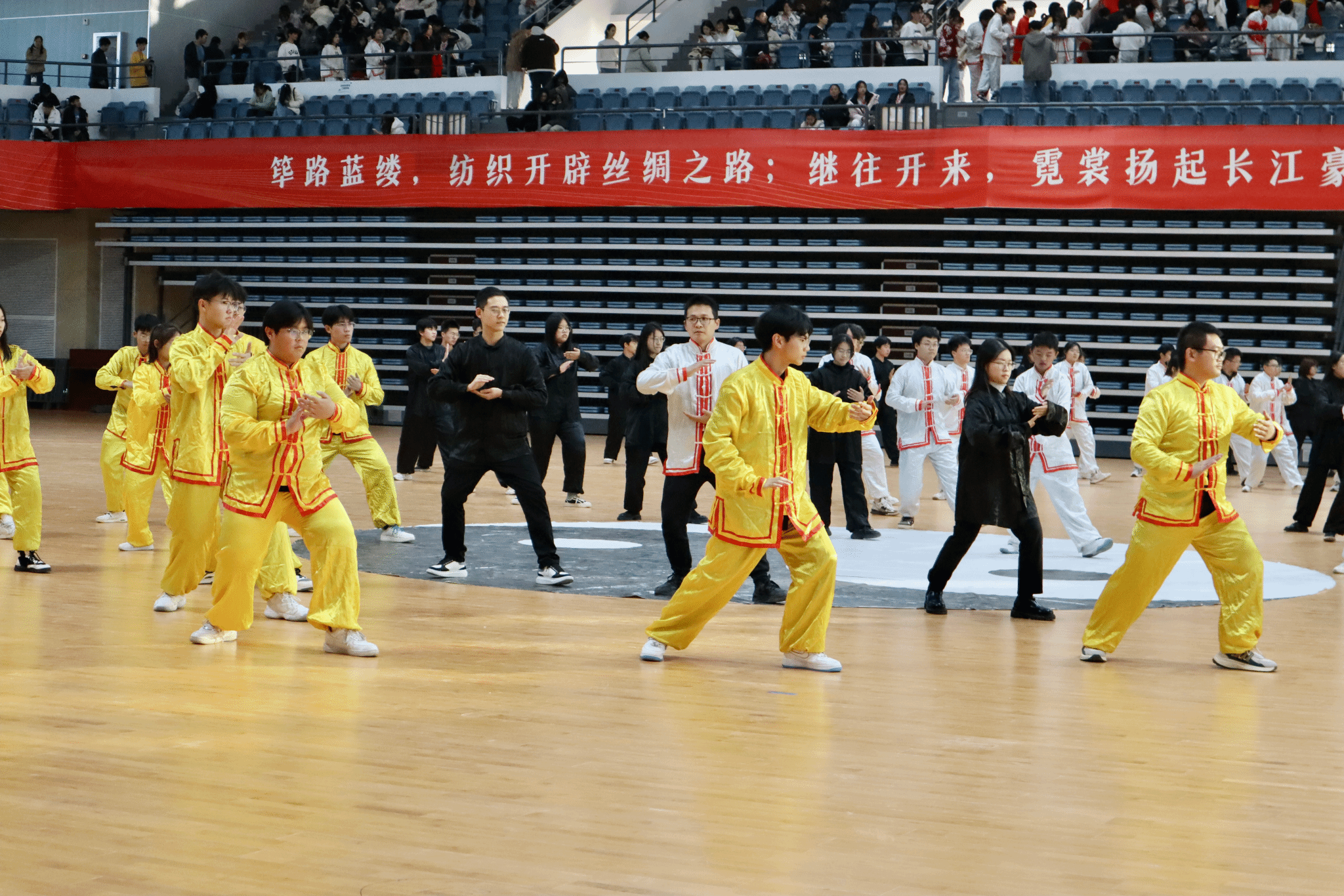 为弘扬中华优秀传统文化,全面提升学生综合素质,强化学生身体机能,丰富学生课余生活,11月25日,学校在阳光校区体育馆举行第九届太极拳比赛。十七支参赛队登场表演,学工部、团委、体育课部负责人及各二级学院党委副书记和数百名观众在现场观看了此次比赛。由学工办主任张朋龙老师、2021级辅导员冉晨老师、2023级辅导员陈珍老师以及近百名学生组成的代表队以9.51分荣获本届太极拳一等奖。