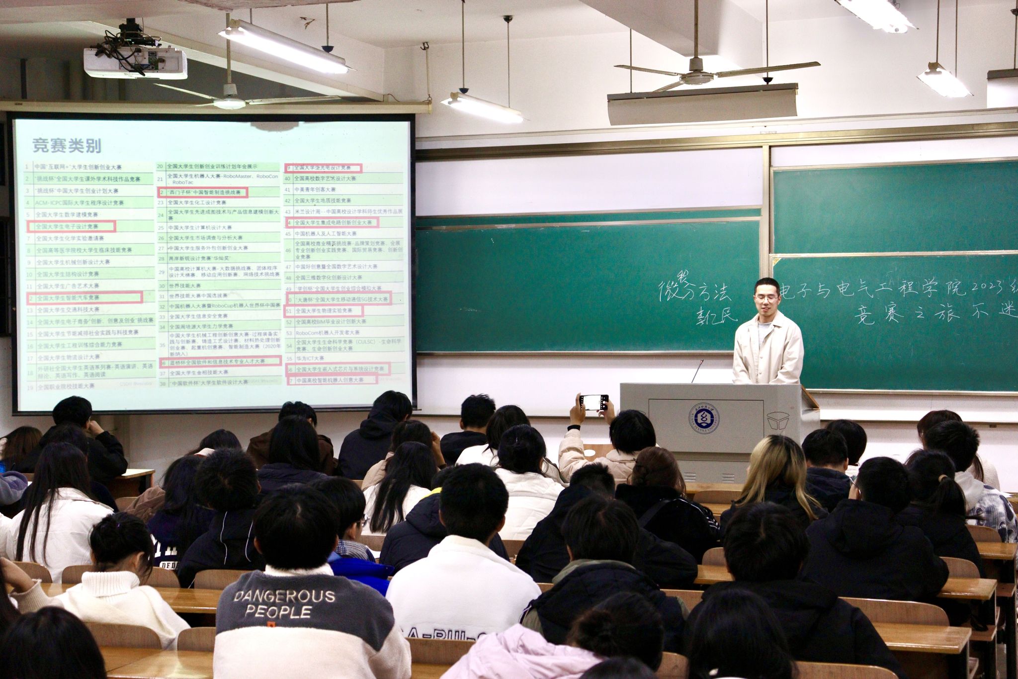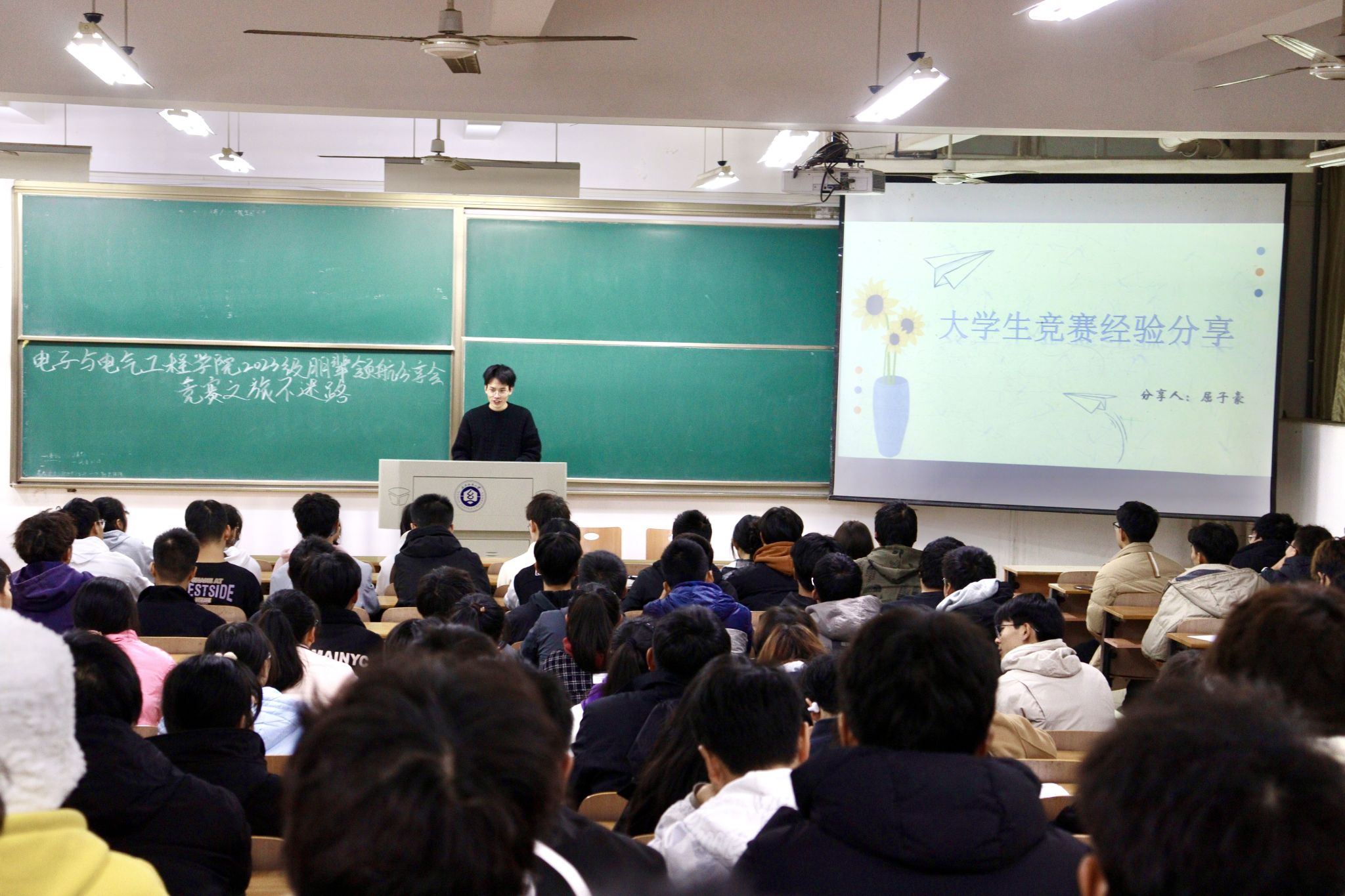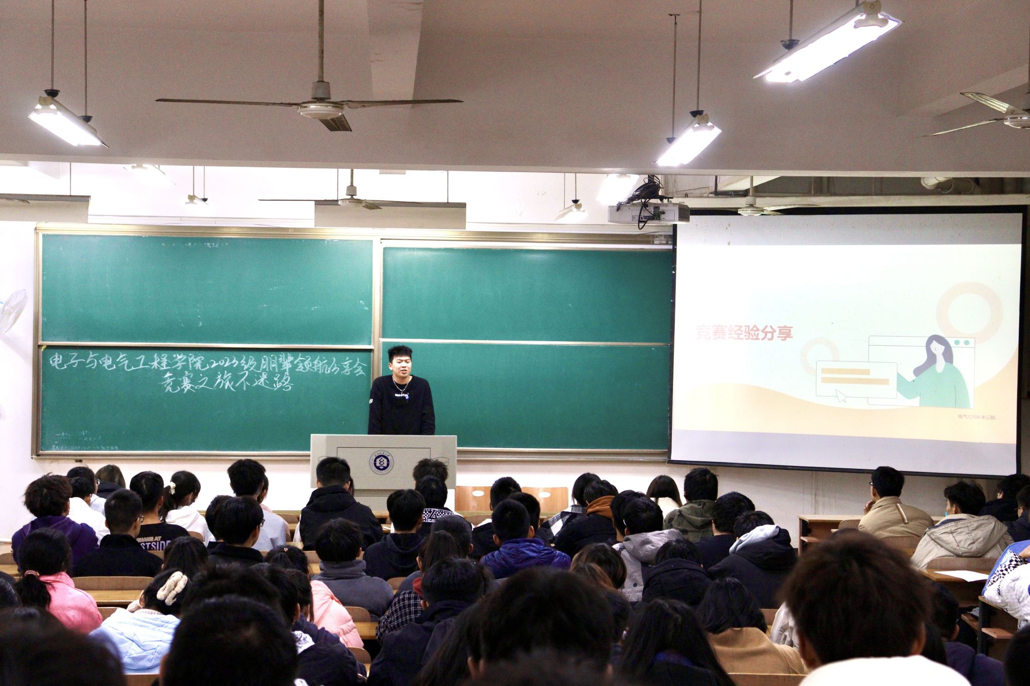 为助力新生更全面、深入地了解学科竞赛相关情况,进一步培养学生创新思维和创新意识,不断加强学风建设,发挥优秀青年学生朋辈影响力和号召力,11月26日晚上,WilliamHill中文在阳光校区六号教学楼111教室和113教室开展了“竞赛之旅不迷路”朋辈领航分享会活动。本次分享会由电气12104朱云航、电气12104班屈子豪、电信12103严业畅、通信12101班梅寒4名同学担任主讲人,2023级辅导员陈珍老师及全体2023级学生参加本次活动。