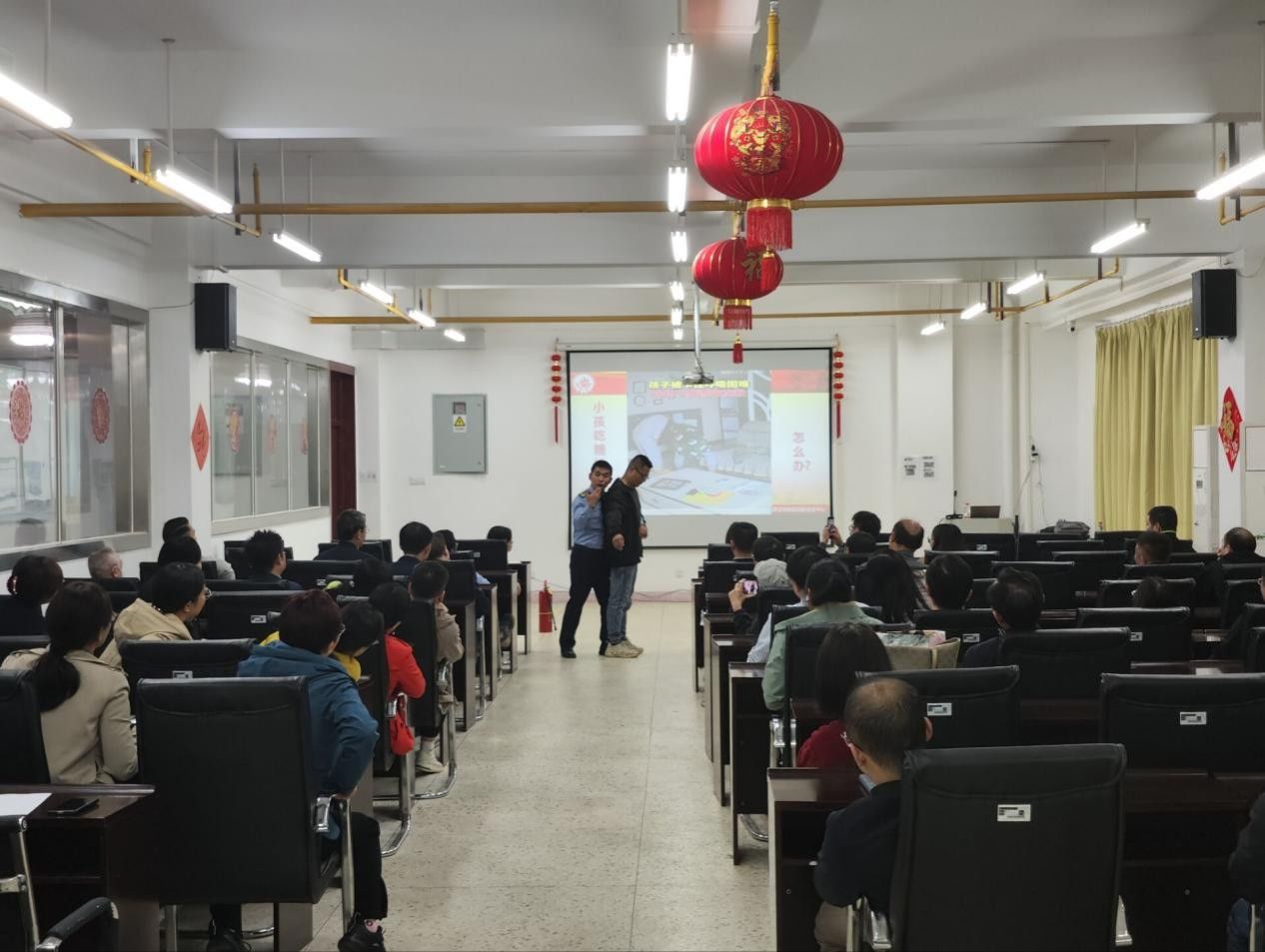 首先,王警官讲解并演示了海姆利克急救法,并带领大家进行现场实操演练。随后,王警官围绕高校事故案例及火灾特点、场所火灾防范措施和初期火灾的扑救等方面进行了详实的授课,组织观看了一些警示案例片,引人深思。讲解过程中,他亲自演范灭火器和其他消防工具的使用方式,加强了大家对基本消防知识的认识。