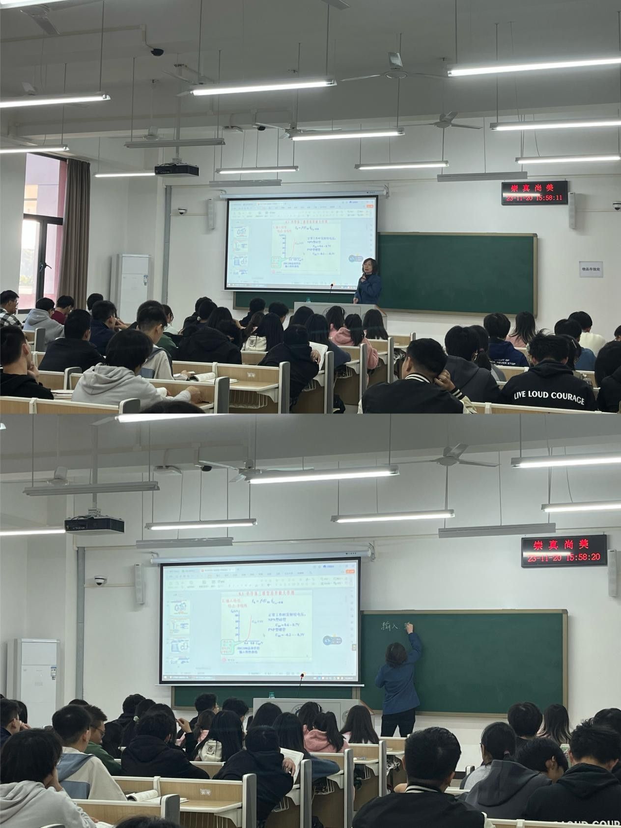 11月20日,刘莉教授为青年教师们讲述了我院为其他学院工科专业开设的学科基础课程电工电子学。课堂上,刘老师以提问的方式与学生进行多轮互动,在多媒体与板书结合的基础上,将重要知识点以多种方式呈现。学生在课堂上能够轻松掌握老师传授的知识,整个课程气氛活跃,同学们精神抖擞。参加观摩的老师在听课记录表上这么概述刘老师的课堂教学:刘莉老师讲课思路清晰、表达自然、过程流畅、语言生动富有感染力,非常值得我们年轻老师学习,对我们在以后的教学经验与教学方法上具有极大的借鉴和参考价值。