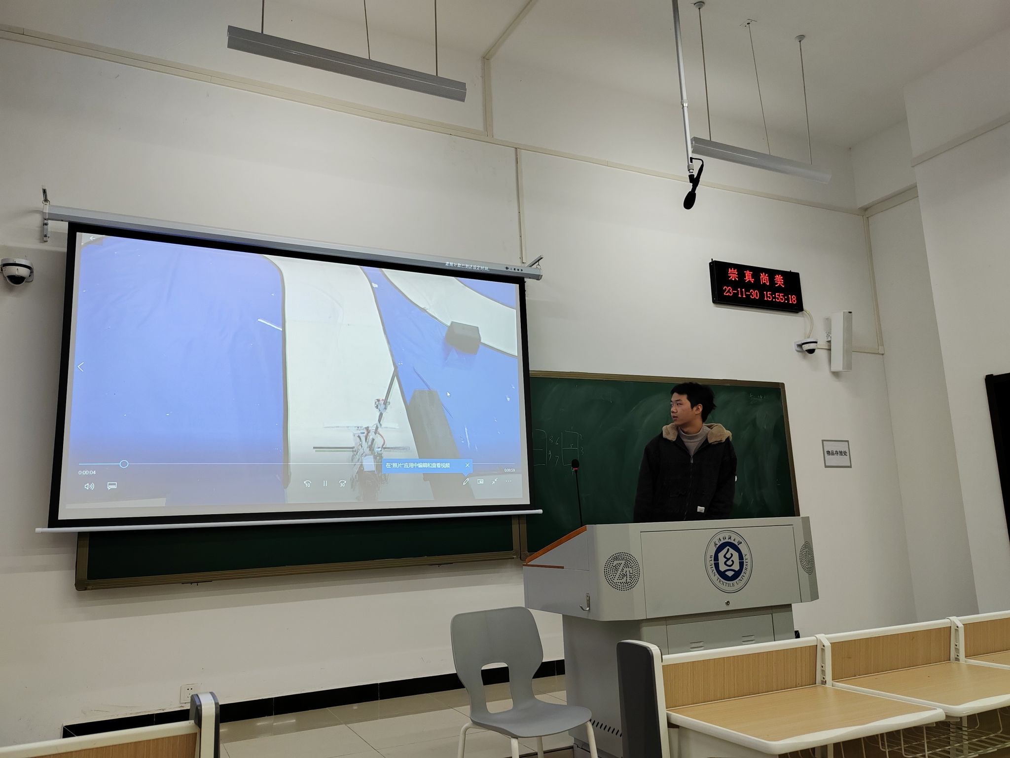 佘楚鸿同学分享了“ 运动目标控制与自动追踪系统设计”,他先回顾自己参加电子设计竞赛经历,接着通过视频讲解了运动目标控制与自动追踪系统这个比赛作品的设计方法,尤其介绍了自己如何解决设计过程中遇到难点问题的心路历程,最后用自己的参赛经历告诉同学们,如果要参加竞赛就要早做准备,并通过参与实际项目来提升实操能力,从而增加自己的核心竞争力。