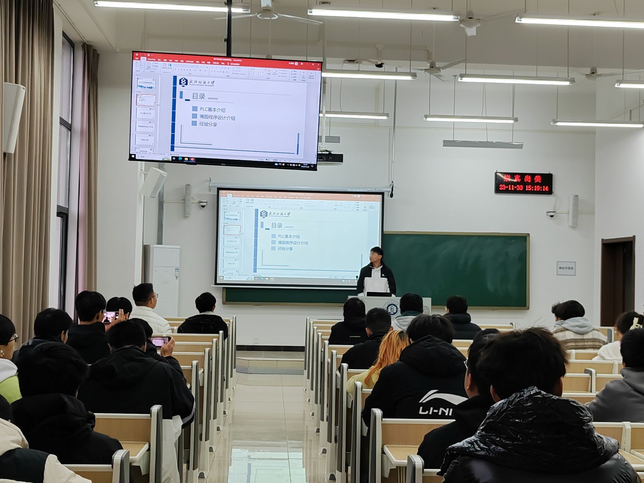 聂思顺同学分享了“基于S7-1200的电梯控制系统设计”,他由PLC控制器的结构特点和博途开发软件的使用开场,深入浅出地讲解了多部多层电梯群控方法,建议同学们要积极参加各类学科竞赛, 通过竞赛来加深对所学知识的理解和运用,而竞赛获奖反过来会进一步提升自己学习的自信心和主动性。