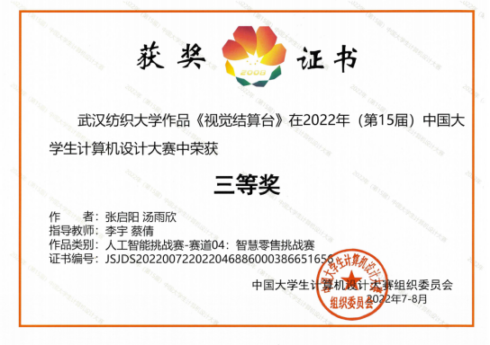 中国大学生计算机设计大赛是2022年教育部认可的56项全国普通高校大学生竞赛排行榜的榜单赛事,参赛对象是中国大陆高校当年在籍的本科生(含当年毕业的本科生、来华留学本科生)。本届赛事从2022年1月启动,全国分六大赛区(济南决赛区、沈阳决赛区、厦门决赛区、上海决赛区、南京决赛区、杭州决赛区),全国900多所院校10万余件作品参赛。在人工智能挑战赛赛道智慧零售挑战赛中,由WilliamHill中文2020级研究生王雪松同学任领队,2018级本科生张启阳、汤雨欣两位同学组成的参赛队,历经校级初赛、省级复赛激烈PK,最终进入国赛复赛。复赛全程5天,WilliamHill中文参赛队经过作品初评、实物测试、远程答辩、专家质询等环节最终取得了优异成绩。