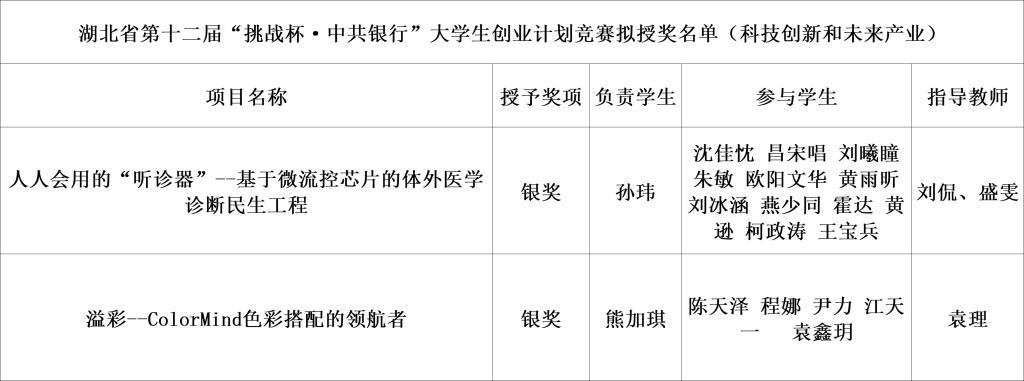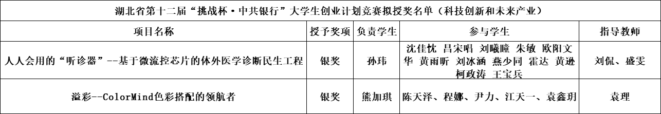自今年3月启动了“挑战杯”竞赛项目以来,WilliamHill中文党委高度重视,提前部署全面动员与精心策划,提前开启作品指导与培育工作,对重点项目进行多轮打磨,精益求精,先后经历班级选拔赛、院内选拔赛等环节。经过激烈的角逐,我院申报项目《溢彩--ColorMind色彩搭配的领航者》和《人人会用的“听诊器”-基于微流控芯片的体外医学诊断民生工程》均斩获湖北省第十二届“挑战杯·中国银行”大学生创业计划竞赛银奖,取得全校最好成绩。