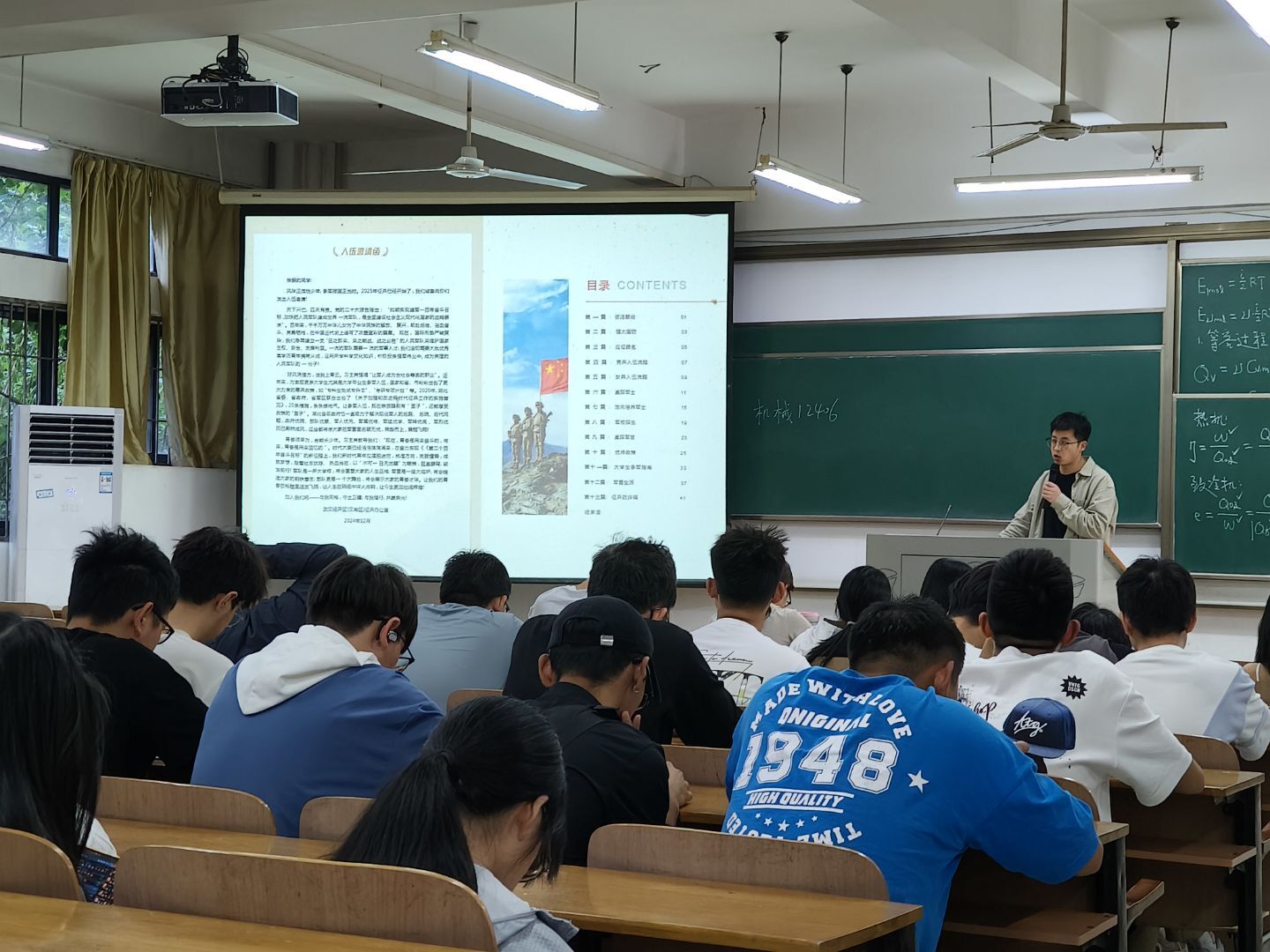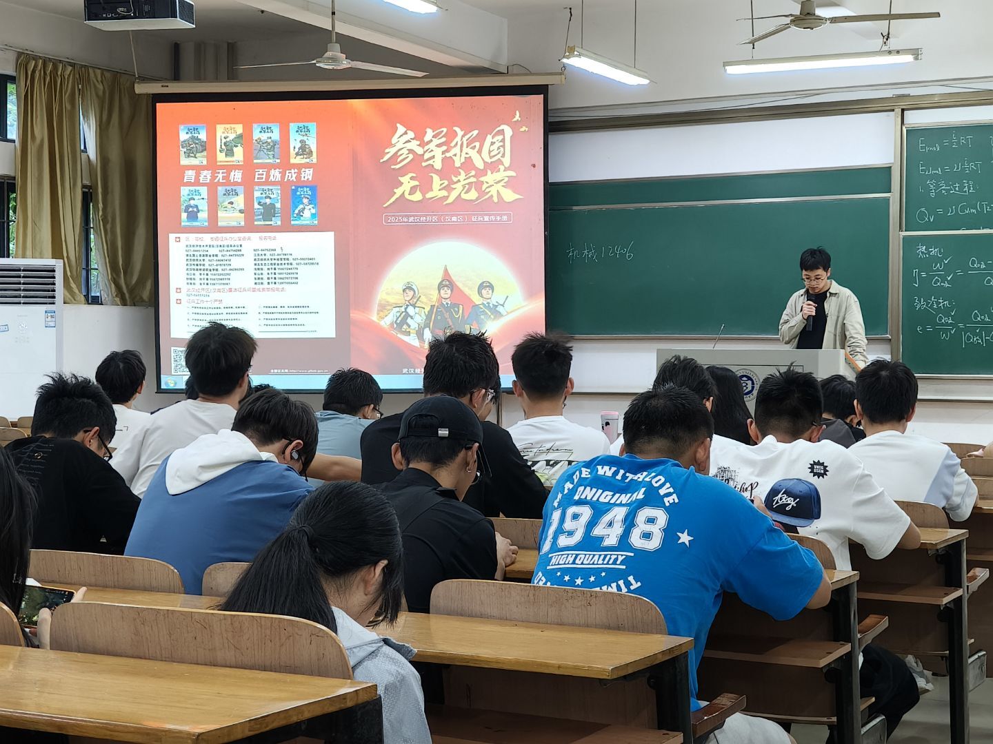 班会伊始,辅导员以入伍邀请函为切入点,字里行间传递的光荣感与使命感,让同学们深切感受到投身军旅的无上荣光与时代责任,通过图文并茂的形式,对空军、海军、火箭军、武警部队等不同军种的责任与使命展开详细介绍。此外,还着重解读了应征入伍的相关政策,尤其是针对大学生群体的优待措施,涵盖学业保障、就业扶持、经济补助等多个方面,为同学们描绘出军旅生涯与个人发展相互成就的广阔前景。现场氛围热烈,不少同学感慨:“青春风华正茂时投身军营,既能实现人生价值,又能享受国家的有力保障,这是青春最热血的选择!”