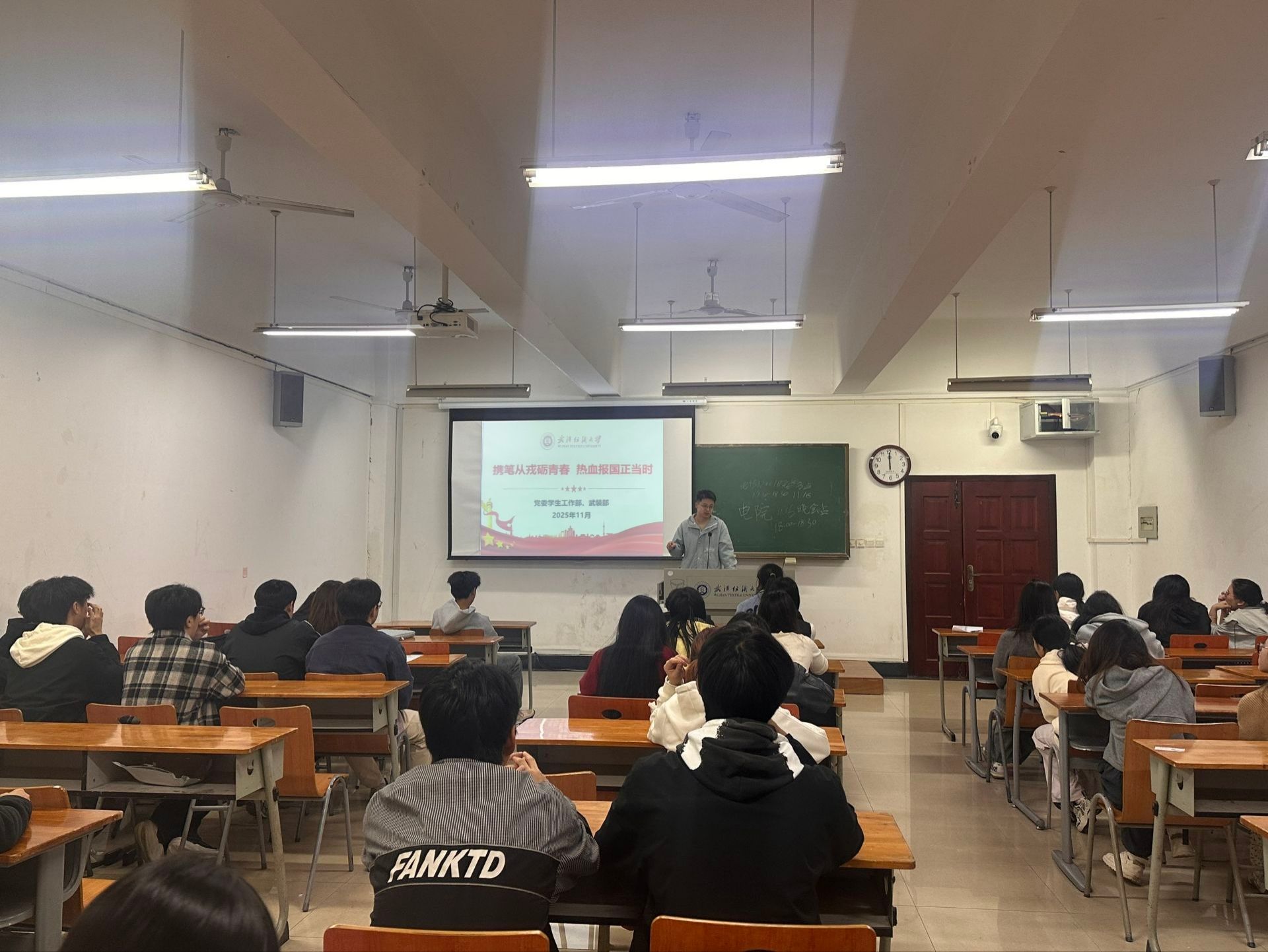 11月23日,电子电气学院开展“携笔从戎砺青春 热血报国正当时”主题班会,辅导员向学子们普及2026年征兵政策,激发青年参军报国热情。班会围绕依法服役义务、征兵条件标准、军种特色等核心内容,重点解读了年龄放宽、体检要求等关键政策,通过图文展示陆军、海军、火箭军等多军兵种职能,让同学们直观了解军营使命。