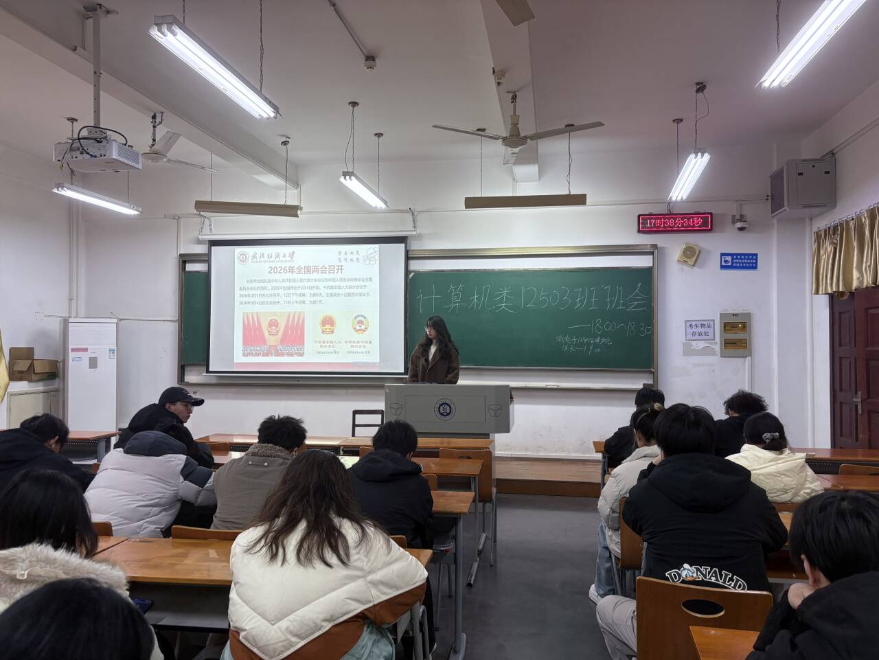 班会现场,辅导员首先为同学们系统讲解全国两会的基本常识,重点解读政府工作报告中的新词热词、五大热点关键词,以及2025年国家发展成就、“十四五”收官成果和“十五五”时期的发展目标与任务。同时,着重梳理了政府工作报告中高“含青量”的民生举措,从青年就业、教育发展、人才培养等方面,让同学们直观感受国家对青年成长的关怀与期许。