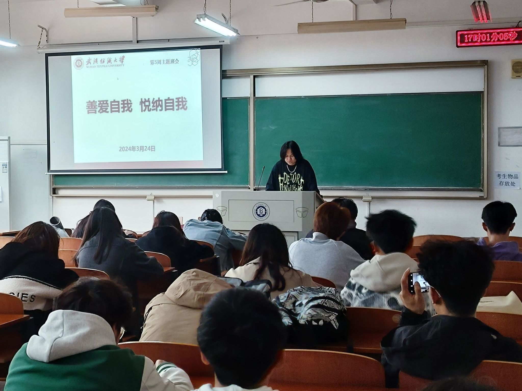 会上,班主任、辅导员首先向学生们提倡了3·25善待自我,关爱自我的精神。随着物质生活水平的提高,人们不再单单只满足身体上的享受,也在追求精神上的快乐。班会上倡导大学生以积极乐观的心态去体验生活,希望同学们在生活的细微处发现生命的美好,从而具备安抚和关心自己的能力。现今的大学生具有开阔的视野和活跃的思维,追求个性化的生活方式,充滿着色彩浪漫的情感,但同时也面临着新的心理问题和冲突。班会还想向同学们介绍了十条爱自己的心理建设方法:照顾好自己的身体,多运动,少熬夜;照顾好自己的情绪,远离内耗,善待自己;停止自责,不要太严格,相信天生我材必有用;接纳不完美,人无完人,我们都是最好的自己。