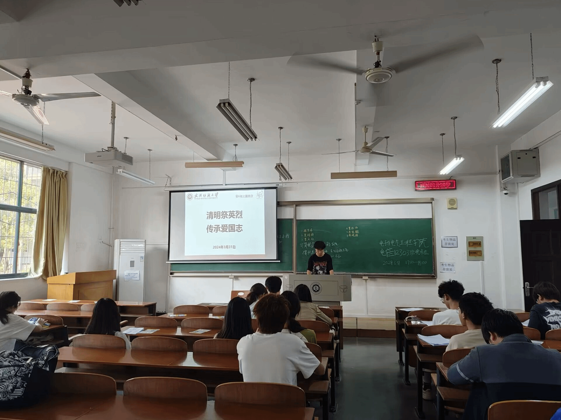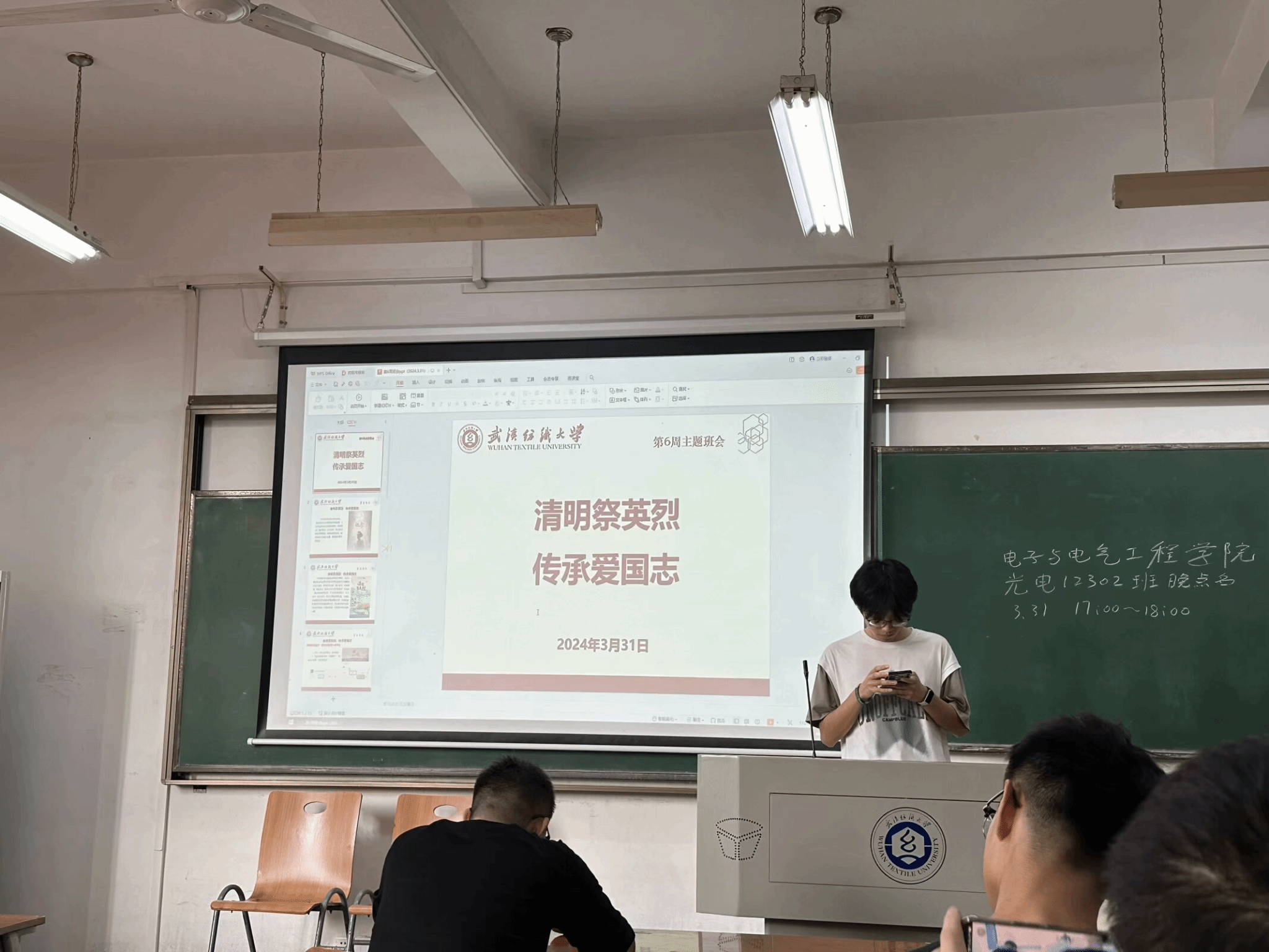 会上辅导员向学生们提到“英雄是民族最闪亮的坐标。” 英雄烈士为人民解放和国家富强、人民幸福作出巨大贡献和牺牲。崇尚英烈、缅怀英烈、学习英烈、捍卫英烈的浓厚厚氛围,凝聚奋进新征程、建功新时代的强大力量,是新时代青年的追求。班会上倡导大学生们以“铸魂·2024·清明祭英烈”为主题,通过网上献花的方式,广泛营造尊崇英烈、学习英烈、捍卫英烈、关爱烈属的浓厚氛围,为湖北加快建设全国构建新发展格局先行区、加快建成中部地区崛起重要战略支点、奋力推进中国式现代化湖北实践,为强国建设、民族复兴伟业贡献自己的一份力量!